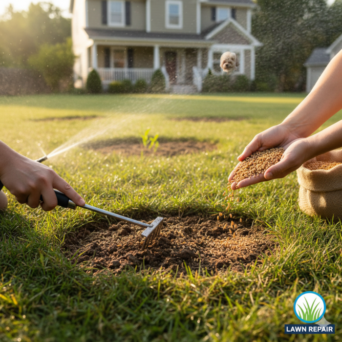 Newly repaired patches are fragile. Water 2-3 times a day for just 5-10 minutes. The goal is to keep the surface damp until the grass is 2 inches tall.